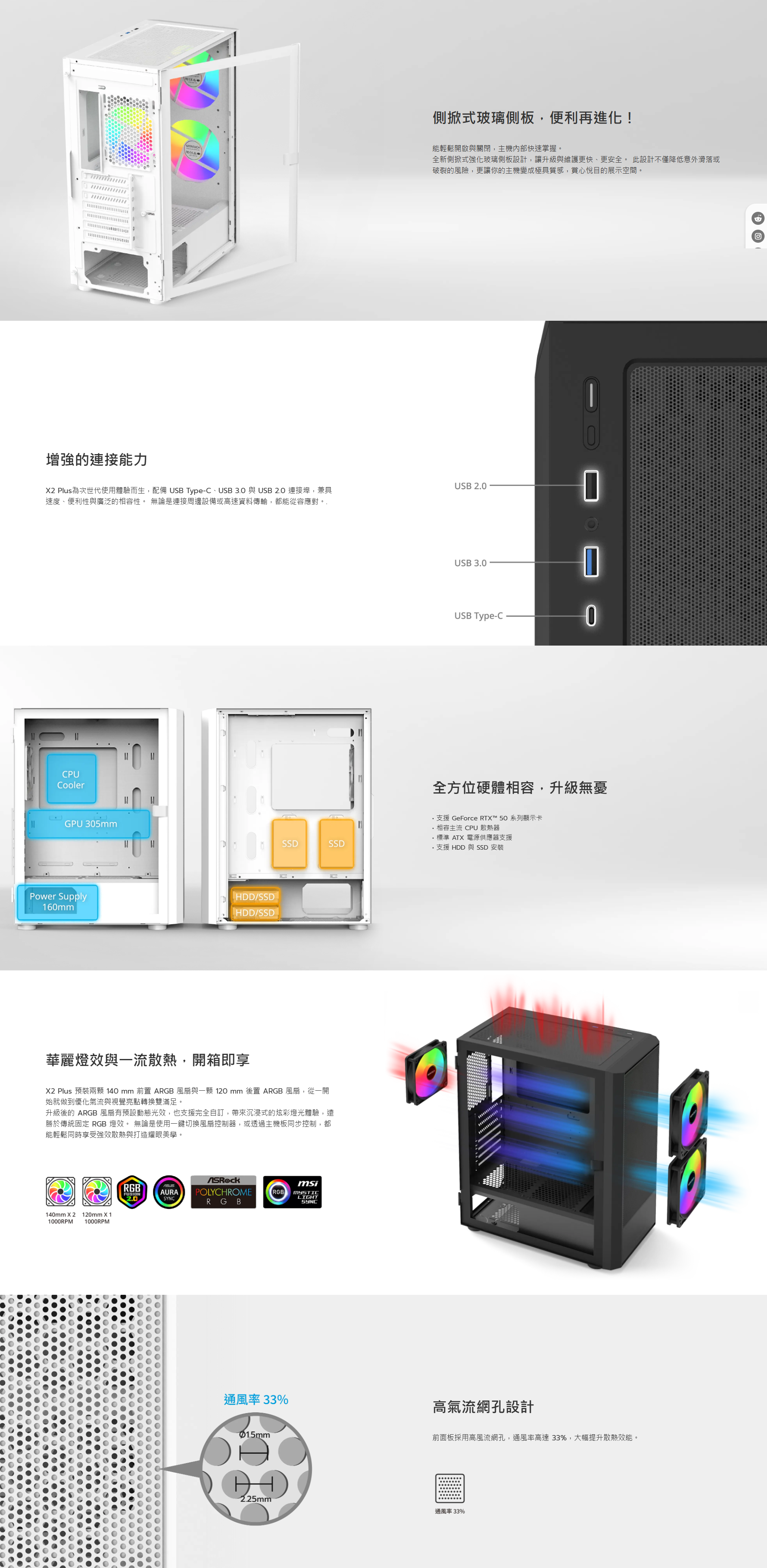 ▶前面板採用高風流網孔,通風率高達 33%,大幅提升散熱效能