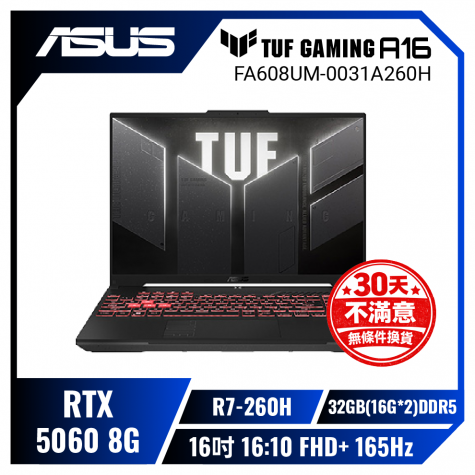 【32G升級版】ASUS TUF Gaming A16 FA608UM-0031A260H 御鐵灰 華碩薄邊框軍規電競筆電/R7-260H/RTX5060 8G/32GB(16G*2)DDR5/512GB PCIe/16吋 16:10 FHD+ 165Hz/W11/含TUF電競滑鼠【筆電高興價】