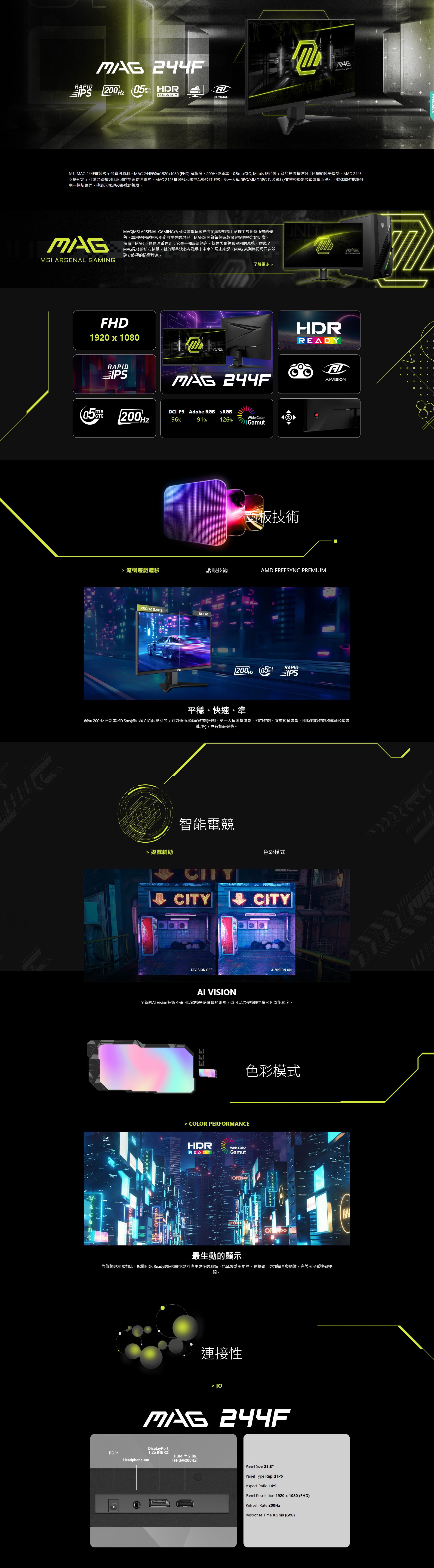 - Rapid IPS 面板-提供 0.5ms(GtG,最小值)快速反應時間,優化螢幕顏色和亮度