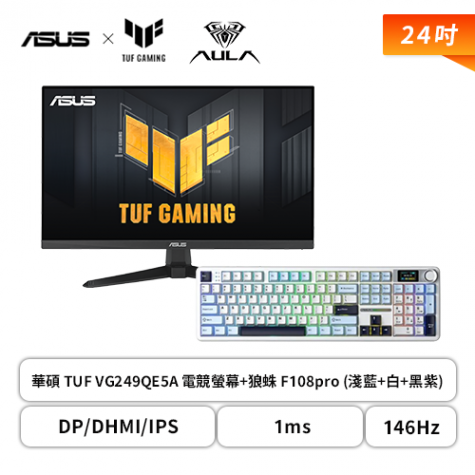 【破盤價】【24型】華碩 TUF VG249QE5A 電競螢幕 (DP/DHMI/IPS/1ms/146Hz/Adaptive Sync/可變超頻驅動/內建喇叭/三年保固)+狼蛛 AULA F108pro (淺藍+白+黑紫 )