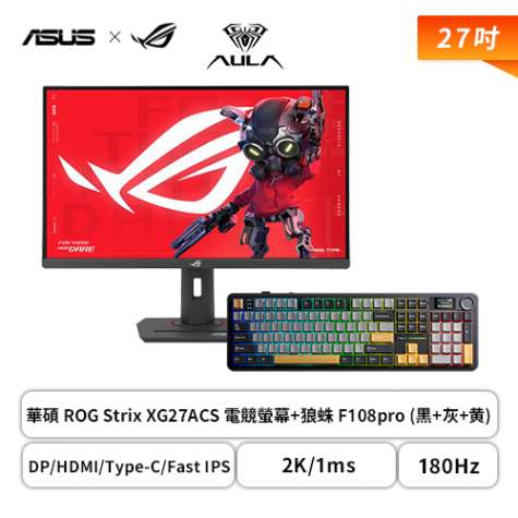 【破盤價】【27型】華碩 ROG Strix XG27ACS 電競螢幕 (DP/HDMI/Type-C/Fast IPS/2K/1ms/180Hz/G-Sync/HDR400/可變超頻驅動 2.0/133% sRGB/可升降/可旋轉/無喇叭/三年保固)+狼蛛 AULA F108pro (黑+灰+黄)