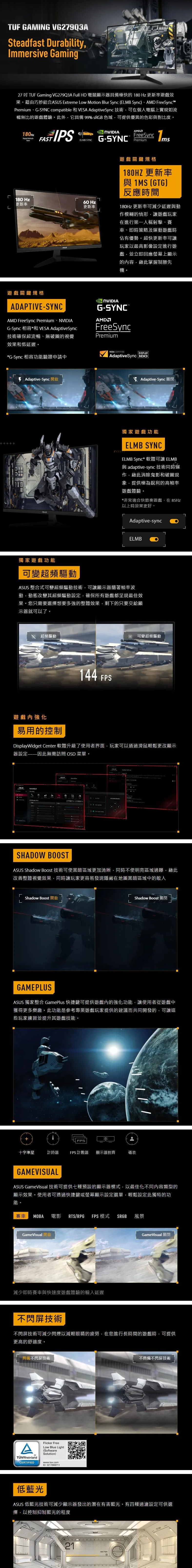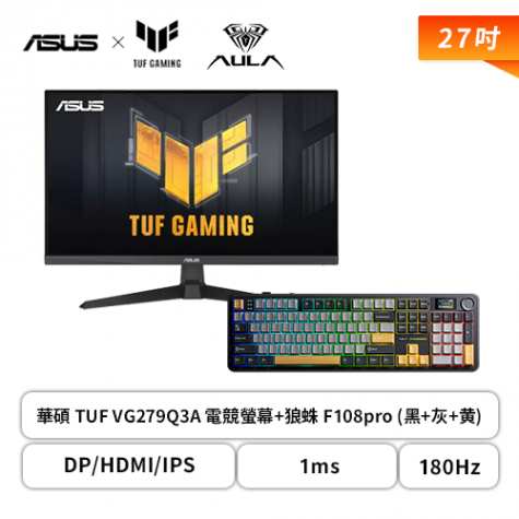 【破盤價】【27型】華碩 TUF VG279Q3A 電競螢幕 (DP/HDMI/IPS/1ms/180Hz/FreeSync Premium/可變超頻驅動/99% sRGB/內建喇叭/三年保固)+狼蛛 AULA F108pro (黑+灰+黄)