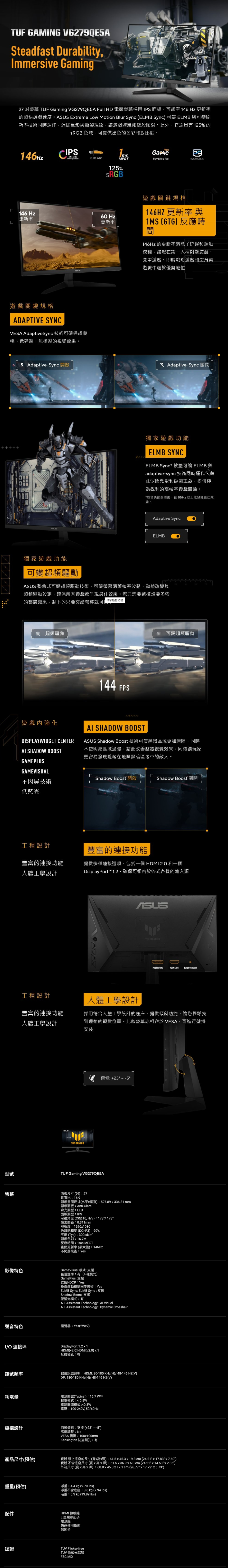 - 27 吋 Full HD (1920x1080) 電競螢幕,具備 146Hz (超頻) 更新率,專為職業玩家和沈浸式遊戲而設計