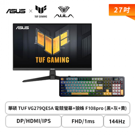 【破盤價】【27型】華碩 TUF VG279QE5A 電競螢幕 (DP/HDMI/IPS/FHD/1ms/144Hz/低藍光認證/內建喇叭/三年保固)+狼蛛 AULA F108pro (黑+灰+黄)