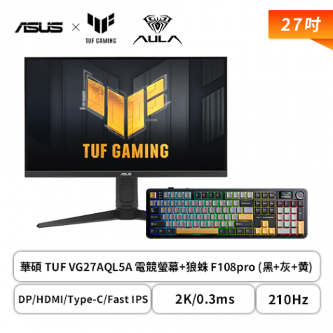 【破盤價】【27型】華碩 TUF VG27AQL5A 電競螢幕 (DP/HDMI/Type-C/Fast IPS/2K/0.3ms/210Hz/Freesync Premium/G-Sync/HDR400/可變超頻驅動/130% sRGB/可升降/可旋轉/內建喇叭/三年保固)+狼蛛 AULA F108pro (黑+灰+黄)