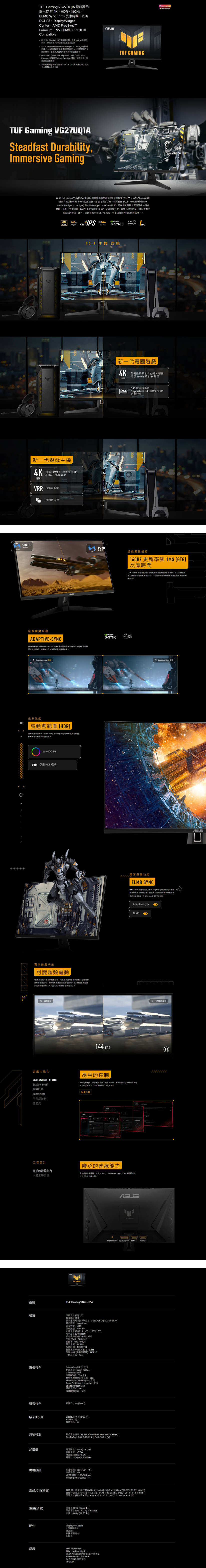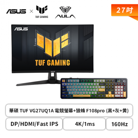 【破盤價】【27型】華碩 TUF VG27UQ1A 電競螢幕 (DP/HDMI/Fast IPS/4K/1ms/160Hz/FreeSync Premium/G-SYNC/HDR10/可變超頻驅動/內建喇叭/三年保固)+狼蛛 AULA F108pro (黑+灰+黄)