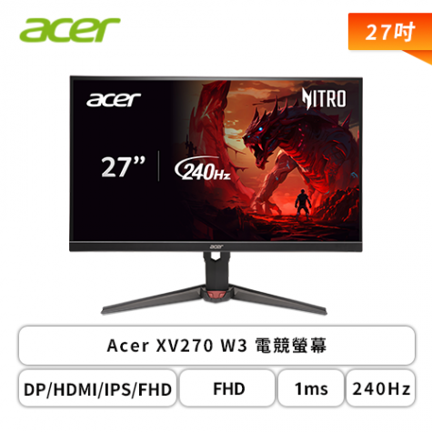 216829【【27型】Acer XV270 W3 電競螢幕 (DP/HDMI/IPS/FHD/1ms/240Hz/FreeSync/可升降旋轉/三年保固)】