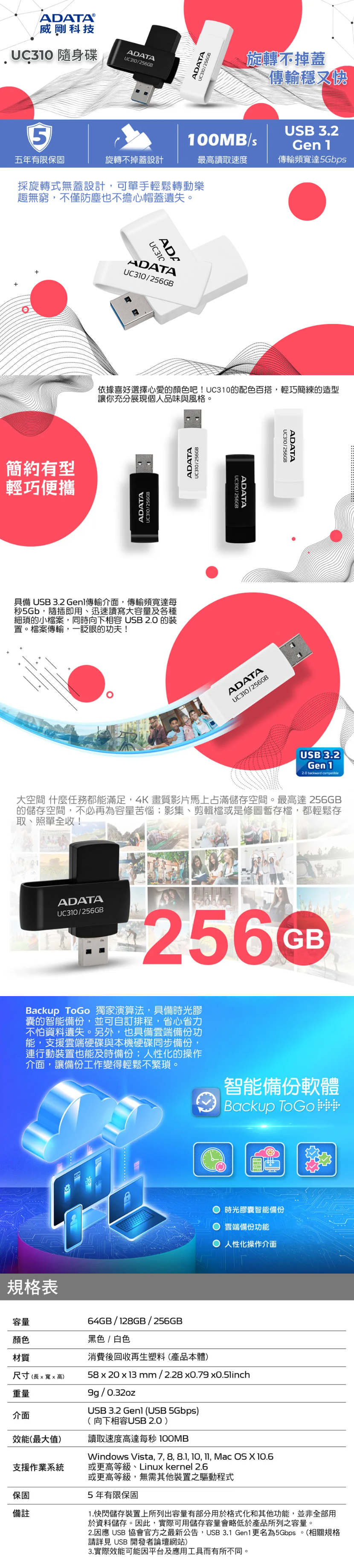 ADATA 威剛UC310 USB3.2 Gen1 64G 旋轉隨身碟 時尚黑