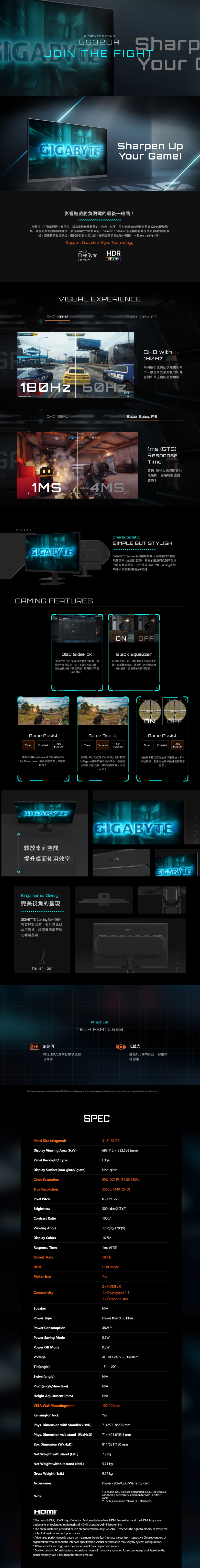 1. 流暢影像體驗:31.5吋 QHD SS IPS 面板,180Hz 高刷新率,1ms 快速反應時間,適合遊戲與多媒體需求。