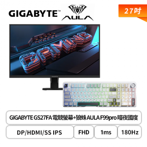 【破盤價】【27型】GIGABYTE GS27FA 電競螢幕(DP/HDMI/SS IPS/1ms/180Hz/HDR READY/FreeSync/黑平衡技術/萊因認證/低藍光/不閃屏/無喇叭/三年保固)+狼蛛 AULA F99pro 暗夜國度 (淺灰+白+深灰)