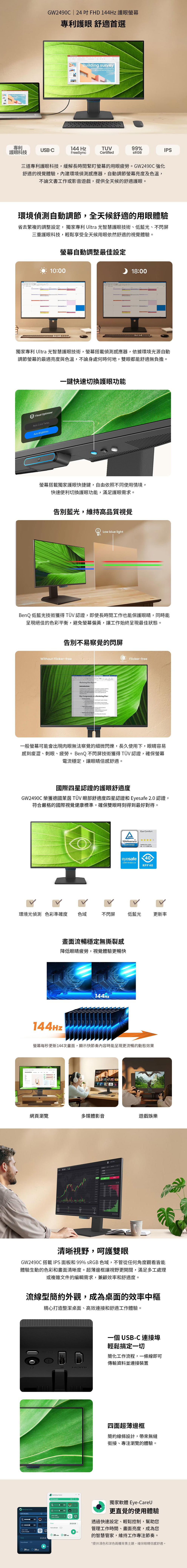 三道專利護眼科技,緩解長時間緊盯螢幕的用眼疲勞。 GW2490C 強化舒適的視覺體驗,內建環境偵測感應器, 自動調節螢幕亮度及色溫,不論文書工作或影音遊戲,提供全天候的舒適護眼。