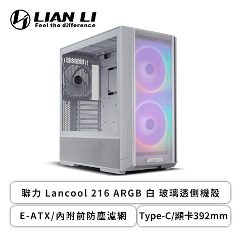 187431【聯力 Lancool 216 ARGB 白 玻璃透側機殼 (E-ATX/Type-C/內附前防塵濾網/內建風扇前2後1/顯卡392mm/塔散180mm/水冷360mm)】