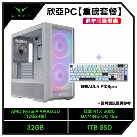【重磅套餐-過年限量優惠】AMD Ryzen9 9900X3D【12核24緒】+技嘉 X870E AORUS PRO ICE+威剛 XPG LANCER BLADE DDR5-6000 32G(16G*2)-白(CL30)+威剛 XPG S70 BLADE 1TB+技嘉 RTX 5080 GAMING OC 16G+MONTECH HyperFlow Digital 360 白+EPONTEC MARS 1000W+聯力 Lancool 216 ARGB 白 玻璃透側機殼+狼蛛 AULA F018pro