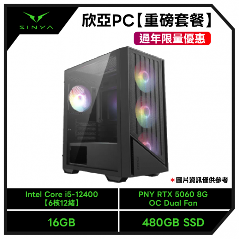【重磅套餐-過年限量優惠】Intel Core i5-12400【6核12緒】+華碩 PRIME B760M-F D4-CSM +威剛 ADATA DDR4-3200 16G+美光 Crucial E100 480GB+PNY RTX 5060 8G OC Dual Fan+微星 MAG A650BN+微星 PRO FORGE M051A 玻璃透側機殼