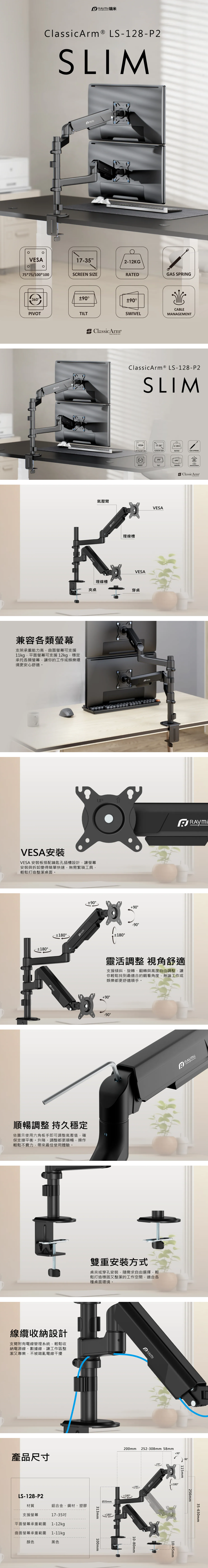 SLIM系列 Raymii 瑞米 LS-128-P2 氣壓式雙螢幕支架 35吋 12KG 螢幕架 螢幕伸縮懸掛支架