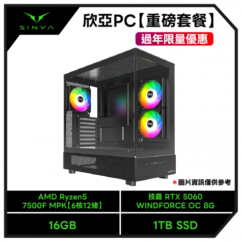 【重磅套餐-過年限量優惠】AMD Ryzen5 7500F MPK【6核12緒】+技嘉 B650M GAMING X AX+威剛 ADATA DDR5-5600 16G+鎧俠 KIOXIA EXCERIA PLUS G3 1TB+技嘉 RTX 5060 WINDFORCE OC 8G+XPG 威剛 KYBER 750W+MONTECH XR 黑 全景玻璃機殼