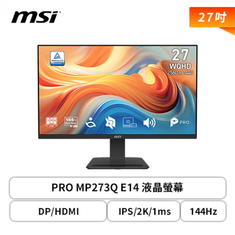 【27型】MSI PRO MP273Q E14 液晶螢幕 (DP/HDMI/IPS/2K/1ms/144Hz/防閃爍/低藍光/內建喇叭/三年保固)