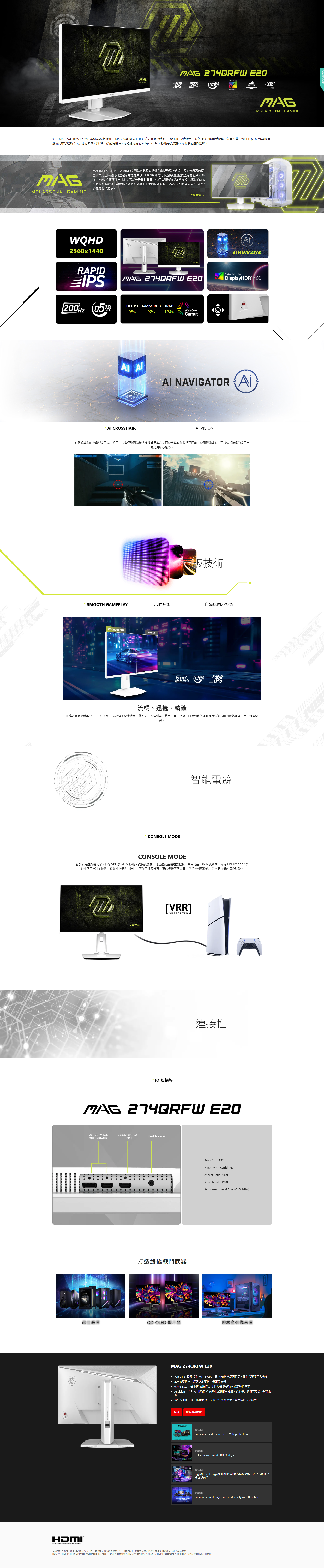 - Rapid IPS 面板-提供 0.5ms(GtG,最小值)快速反應時間,優化螢幕顏色和亮度