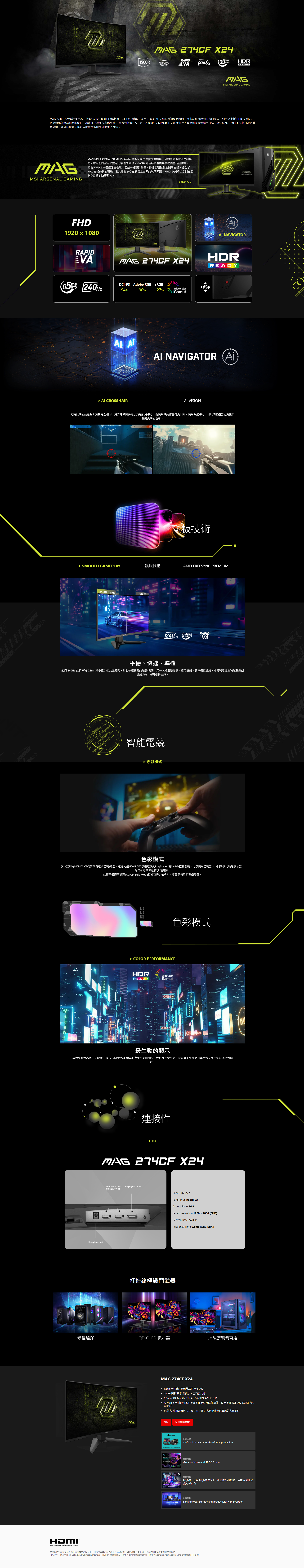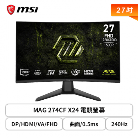 【27型】MSI MAG 274CF X24 電競螢幕 (DP/HDMI/VA/FHD/曲面/0.5ms/AMD FreeSync/HDR/240Hz/無喇叭/三年保固)