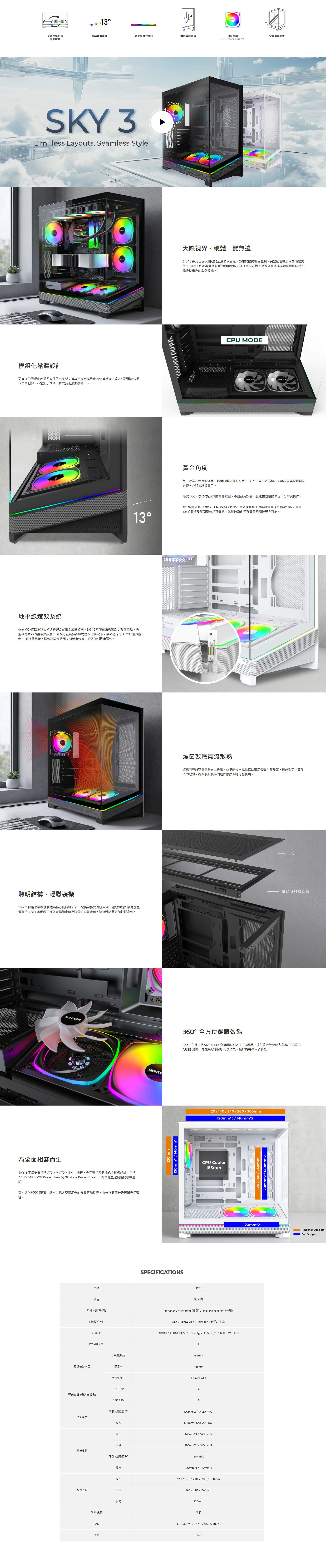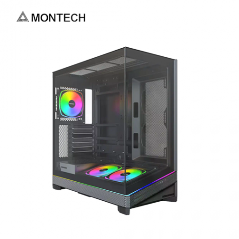 MONTECH SKY 3 黑色 全景玻璃機殼 (ATX/Type-C/內建風扇底2後1/無A柱/顯卡445mm/塔散185mm)