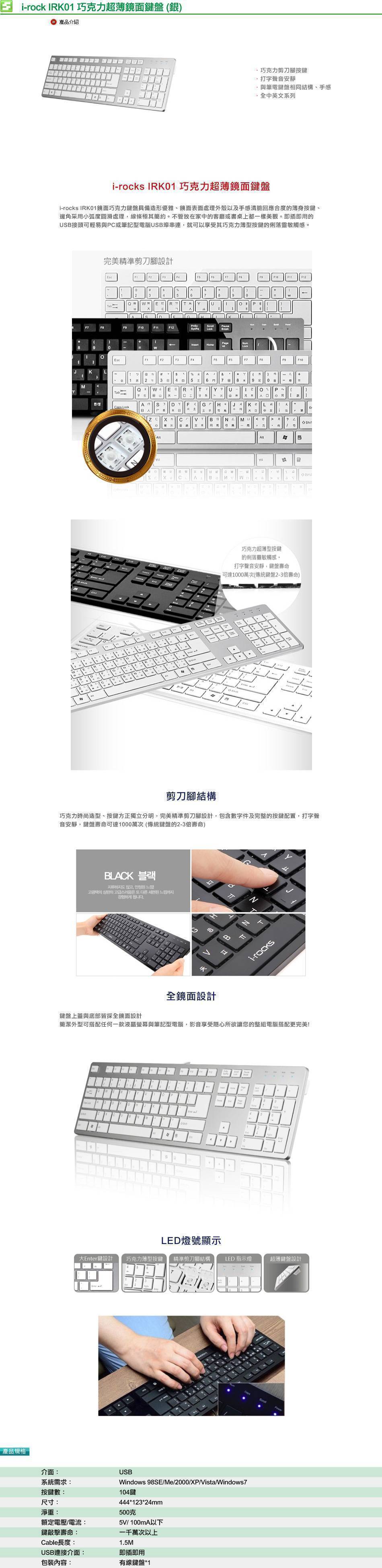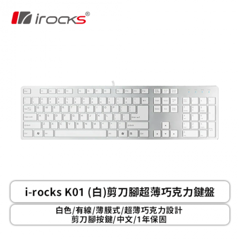 i-rocks K01 (白)剪刀腳超薄巧克力鍵盤(白色/有線/薄膜式/超薄巧克力設計/剪刀腳按鍵/中文/1年保固)