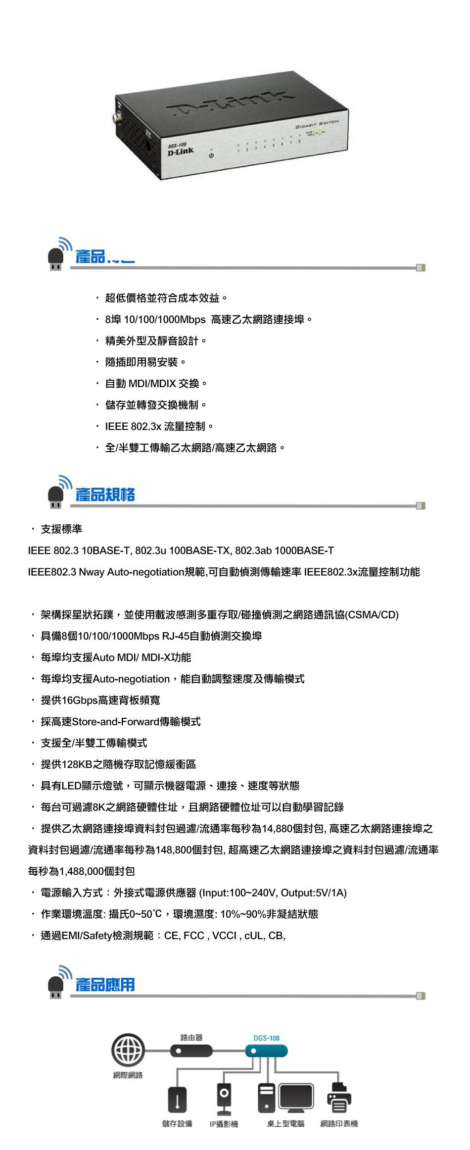 D-Link DGS-108 8埠GIGA非網管節能型網路交換器