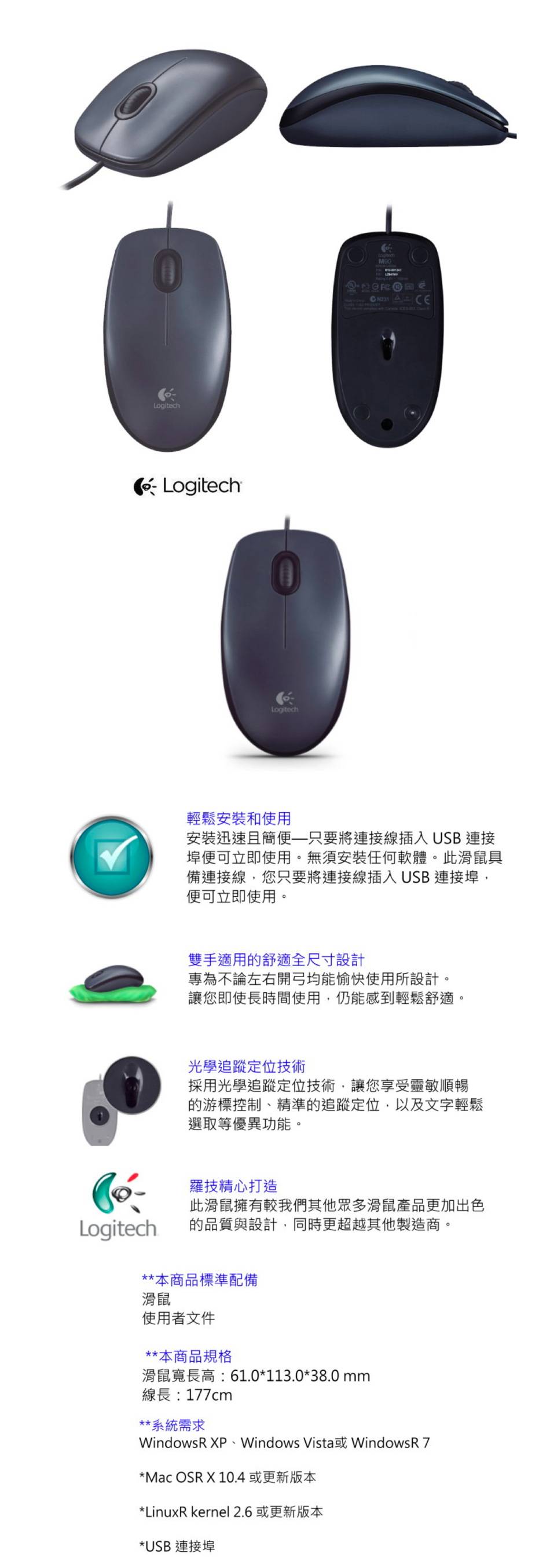 羅技 M90 光學滑鼠(黑色/有線/400dpi/73克/3年保固)