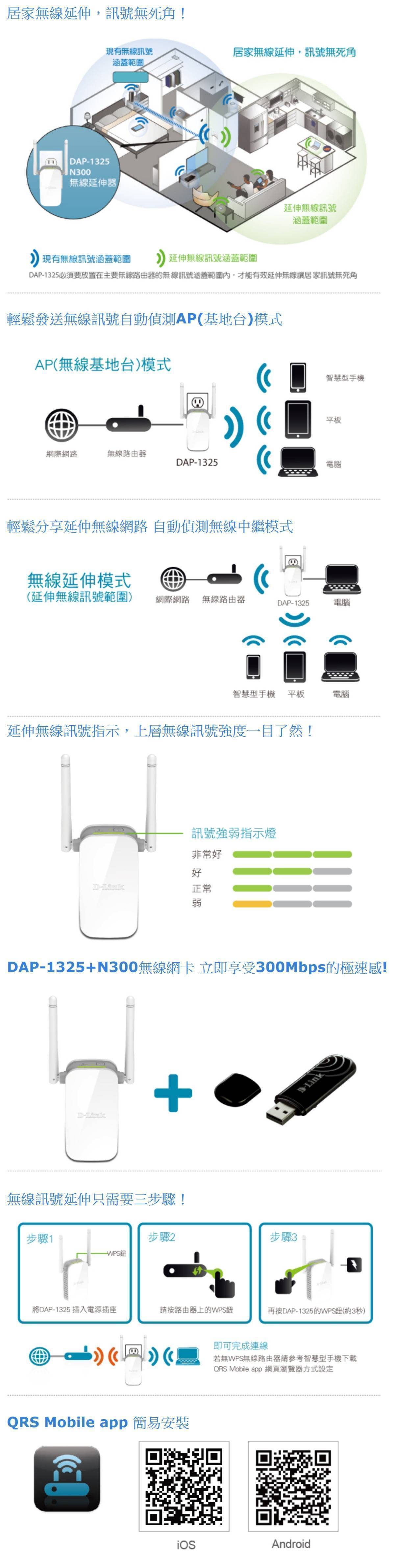 ★WPS單鍵快速延伸居家無線網路範圍 ★Wi-Fi 訊號強度指示燈尋找最適合的擺放位置 ★QRS App手機/平板設定最簡單 ★符合802.11n 無線標準,最高可達300Mbps